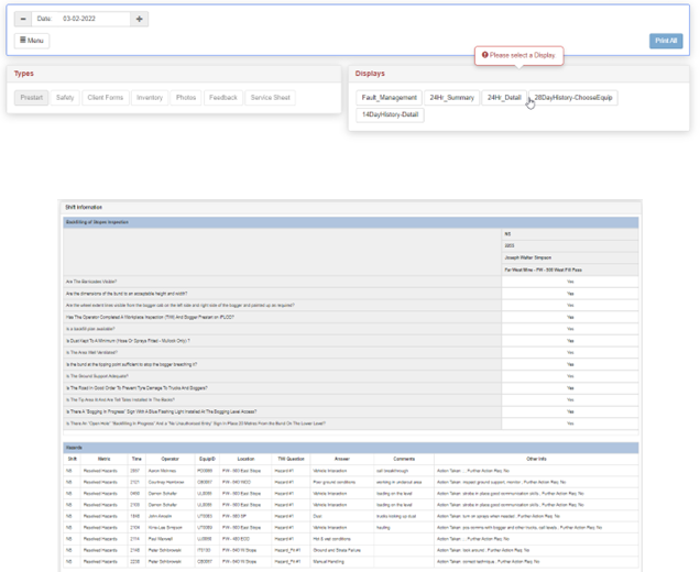 Anything customised for your contract/minesite will be available here also. Data can be saved and printed from this area – Access to this area is only for MANAGE users