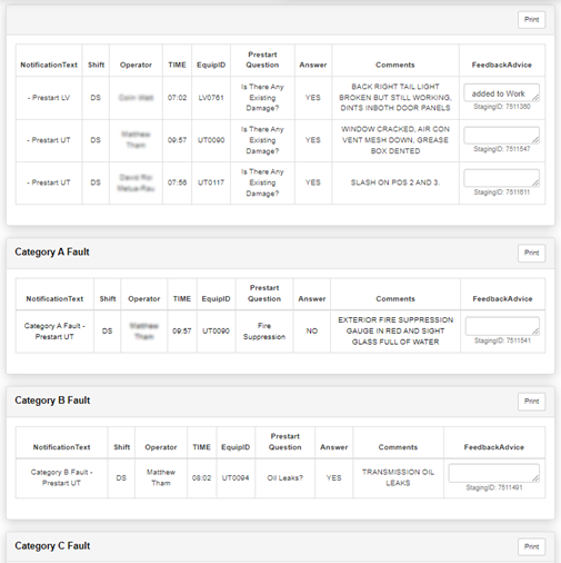 - Pre-starts and faults identified