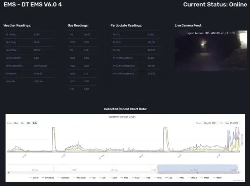 Digital Terrain EMS units are capable of measuring 8 gases, wet and dry bulb, air velocity, dust particulate, and humidity. Environmental readings can be viewed from the surface in our customised real-time dashboards.